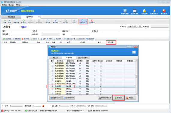 在功能導航窗點擊“業務處理”—》“新開送貨單”打開送貨單界面,然后在工具欄點擊界面設計,單據明細內找到“引單數量”數據項,并設置顯示出來,如下圖所示。