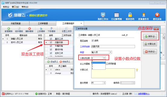 在功能導(dǎo)航窗點擊“綜合管理”—》“工資模板維護(hù)”,在工資模板維護(hù)界面,找到無法輸入小數(shù)位數(shù)的工資項“出勤天數(shù)”,雙擊該工資項,打開工資項目設(shè)置,設(shè)置該工資項的小數(shù)點位數(shù),如下圖所示。