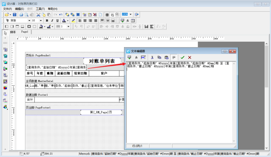 打印模板起始日期--截止日期,在查詢界面打印下點擊“打印格式設計”,選擇打印模板,點擊“設計格式”進入模板設計器,打開金額文本框,復制調用數據項:[查詢條件."起始日期" #Dyyyy]年第[查詢條件."起始日期" #Dmm]期 至 [查詢條件."截止日期" #Dyyyy]年第[查詢條件."截止日期" #Dmm]期,然后確認保存,如下圖: