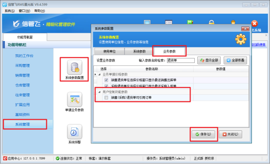 在功能導航窗點擊“系統管理”—》“系統參數配置”,進入系統參數配置界面,點擊“業務參數”,取消勾選“銷售(采購)退貨單可引用訂單”參數,點擊保存按鈕,如下圖所示: