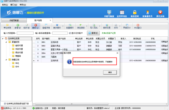 信管飛倉庫管理軟件、信管飛送貨單軟件、信管飛RMS軟件等都支持維護(hù)客戶信息,客戶信息支持開單直接新增和基礎(chǔ)資料中新增,有時開單直接新增導(dǎo)致出現(xiàn)客戶信息重復(fù)的現(xiàn)象,在客戶信息中刪除重復(fù)客戶名稱。會彈出提示“當(dāng)前選擇的往來單位在業(yè)務(wù)單據(jù)中有使用,不能刪除!”本文以“送貨單軟件”為例,示范下如何刪除?