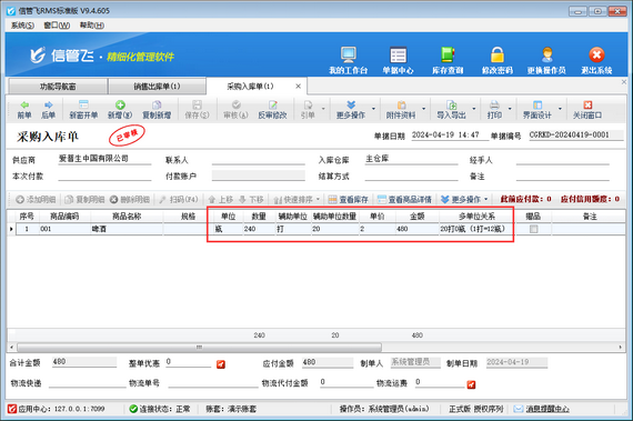 提高操作效率:在采購進(jìn)貨、銷售出庫以及庫存管理等環(huán)節(jié),我們經(jīng)常需要用到不同的計量單位。有了輔助單位功能,我們無需手動進(jìn)行單位換算,軟件會自動完成,大大提高了我們的操作效率。如下圖所示,啤酒采購入庫240瓶(輔助單位數(shù)量:20打)。