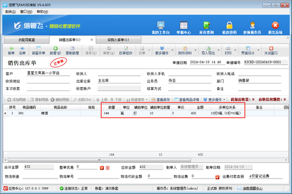 減少誤差:手動進(jìn)行單位換算,很容易出錯。而進(jìn)銷存軟件的輔助單位功能,通過預(yù)設(shè)的換算關(guān)系,能夠準(zhǔn)確地進(jìn)行單位轉(zhuǎn)換,有效減少誤差。如下圖所示,啤酒銷售出庫144瓶(輔助單位數(shù)量12打)。