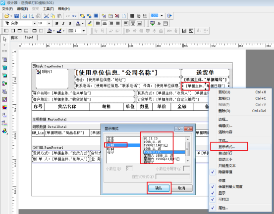 解決方法如下:開單界面點打印-打印格式設計,選中需要修改的模板,點“設計格式”,可進入模板設計器界面,在模板設計器中選中“單據日期”文本框,鼠標點擊右鍵,在彈出的界面上點擊“顯示格式”,進入顯示格式設置界面,如下圖所示: