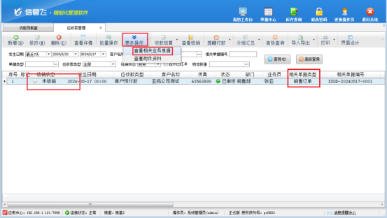 在應收款管理界面,選擇需要刪除的“客戶預付款”記錄,然后在工具欄點擊“更多操作”—》“查看相關業務單據”,可以打開生成此客戶對應的銷售訂單,在訂單界面點“反審修改”,把預收定金刪掉,重新保存單據,對應的客戶預收款記錄自動刪除。