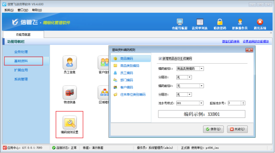 在功能導航窗點“基礎資料”—》“編碼規則設置”即可進入基礎資料編碼規則界面,如下圖所示: