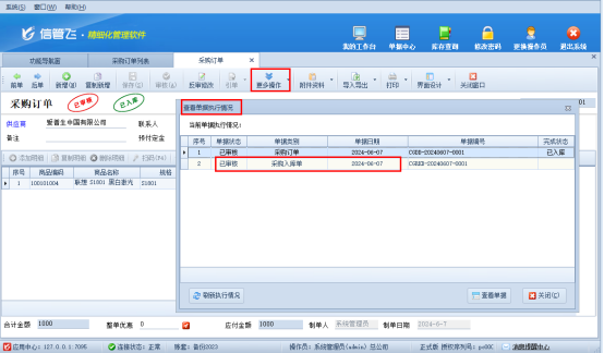 有兩種方式進行查看,一種是采購訂單界面查看。打開采購訂單界面,在工具欄“更多操作”下點擊“查看訂單執(zhí)行情況”,彈出界面可以查看采購入庫單的單據(jù)日期,如下圖所示: