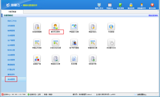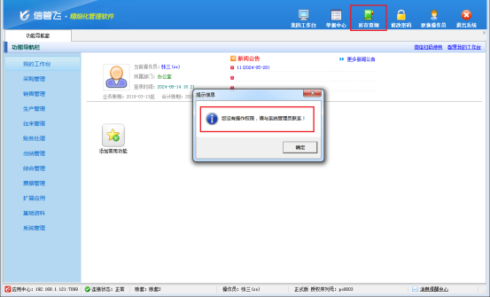 信管飛軟件支持設置多個操作員賬號并對操作員賬號設置權限,有用戶操作員賬號登錄時,查詢庫存可能會出現“您沒有操作權限,請與系統(tǒng)管理員聯系!”的提示,導致無法進行庫存查詢,這是由于操作員沒有權限造成的,本篇文章以“信管飛RMS專業(yè)版”為例介紹下如何解決?