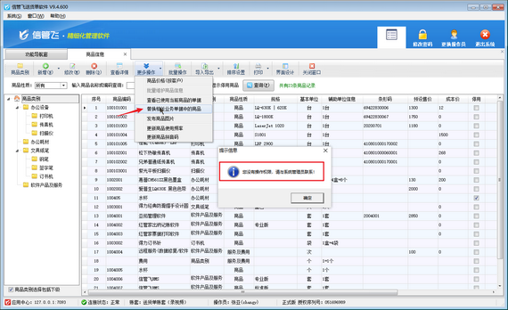 信管飛軟件支持設置多個操作員賬號并對操作員賬號設置權限,有用戶操作員賬號登錄送貨單軟件,在商品信息界面使用“替換相關業務單據中的商品”功能時,系統會彈出提示信息“您沒有操作權限,請與系統管理員聯系!”,如下圖所示。