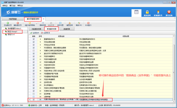 出現以上問題的原因是:操作員賬號沒有操作“替換商品(業務單據)”功能的權限,解決方法如下:使用系統管理員賬號登錄軟件,在功能導航窗點擊“系統管理”—》“操作員及授權”打開操作員管理及授權界面,選擇操作員賬號,在“其他操作權限”界面將“可操作商品信息中的‘替換商品(業務單據)’功能”權限勾選上,然后保存權限設置,如下圖所示。