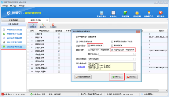 在功能導航窗點擊“系統管理”—》“單據業務參數”,可進入“單據業務參數設置”界面,選中“微信消息參數”,點擊“設置參數”,勾選發送時間點和接收對象,然后保存權限設置,如下圖所示: