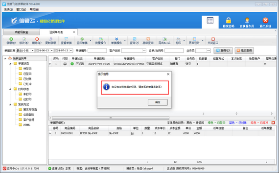 信管飛送貨單軟件通過狀態(tài)控制實現(xiàn)簡單的流程管理(待簽回—》已簽回—》已結(jié)賬),有用戶在過賬單據(jù)時,系統(tǒng)彈出提示信息“您沒有過賬單據(jù)的權(quán)限,請與系統(tǒng)管理員聯(lián)系!”,如下圖所示。