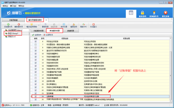 出現(xiàn)此問題的原因是:當(dāng)前登錄的操作員賬號沒有過賬單據(jù)的權(quán)限,解決方法如下:使用系統(tǒng)管理員賬號登錄軟件,在功能導(dǎo)航窗點擊“系統(tǒng)管理”—》“操作員及授權(quán)”打開操作員管理及授權(quán)界面,選擇操作員賬號,在“其他操作權(quán)限”界面將“過賬單據(jù)”權(quán)限勾選上,然后保存權(quán)限設(shè)置,如下圖所示。