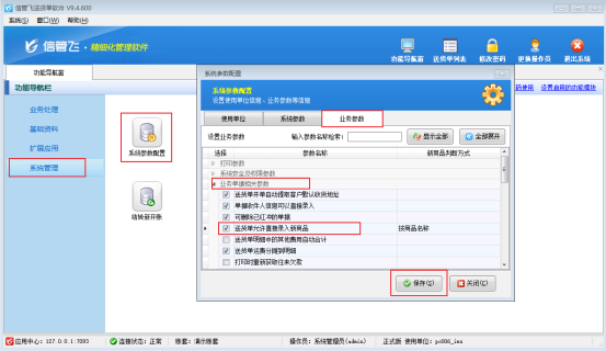 第一步:在功能導(dǎo)航窗點(diǎn)擊“系統(tǒng)管理”—》“系統(tǒng)參數(shù)配置”—》“業(yè)務(wù)參數(shù)”,即可進(jìn)入到“業(yè)務(wù)參數(shù)”配置界面,在業(yè)務(wù)單據(jù)相關(guān)參數(shù)內(nèi)勾選“送貨單允許直接錄入新商品”參數(shù),然后點(diǎn)擊“保存”按鈕保存設(shè)置,如下圖所示: