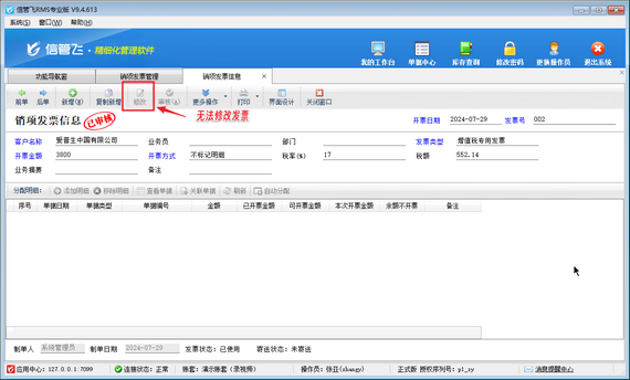 發(fā)票管理模塊是屬于擴(kuò)展模塊,只有在信管飛RMS標(biāo)準(zhǔn)版和專業(yè)版中才能使用。有用戶在使用發(fā)票管理模塊過程中,無法修改進(jìn)/銷項(xiàng)發(fā)票,如下圖所示。