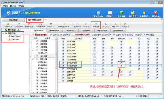 出現(xiàn)以上問題的原因是:操作員賬號(hào)沒有反審修改發(fā)票的權(quán)限。解決方法如下:使用系統(tǒng)管理員賬號(hào)登錄軟件,在功能導(dǎo)航窗點(diǎn)擊“系統(tǒng)管理”—》“操作員及授權(quán)”打開“操作員管理及授權(quán)”界面,選擇操作員賬號(hào),在功能模塊權(quán)限內(nèi)選擇“往來管理”模塊,將進(jìn)/銷項(xiàng)發(fā)票管理的“反審修改”權(quán)限勾選上,然后保存權(quán)限設(shè)置,如下圖所示。