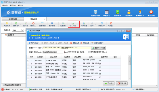 打開商品信息的Excel模板,按模板的標題行進行整理商品信息,整理完成后保存并關閉Excel打開界面。打開軟件商品信息界面,工具欄“導入導出”按鈕下點擊“導入商品資料”選擇整理好的Excel文件,如下圖所示: