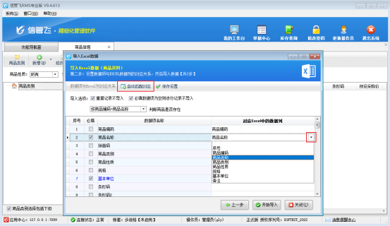 選擇商品Excel文件后,導入界面點擊下一步,設置數據項與Excel數據列的對應關系,點“自動對應”軟件會自動根據數據項名稱和數據列列名是否相同進行自動匹配。也可以按照下圖所示手工選擇對應關系。