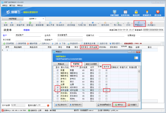 功能導航欄點業務處理,新開送貨單,打開送貨單開單界面,工具欄點擊“界面設計”,選擇單據明細,勾選顯示“成本單價”“成本金額”數據項,并將成本金額后面的“顯示合計”勾選上,然后保存界面設計。