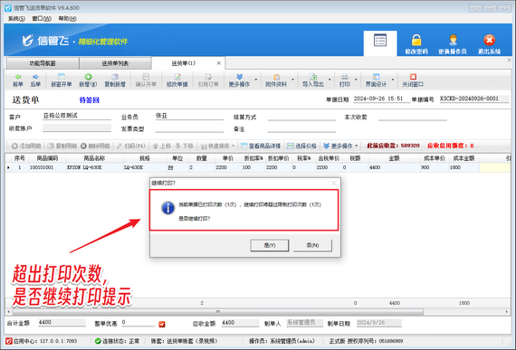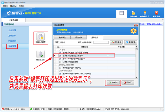 以信管飛送貨單軟件為例,通過(guò)簡(jiǎn)單設(shè)置,即可實(shí)現(xiàn)操作員打印次數(shù)權(quán)限控制。首先,在系統(tǒng)參數(shù)中設(shè)置打印次數(shù)提示;