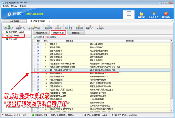 然后,在操作員權(quán)限管理中,取消操作員“超過(guò)打印次數(shù)限制仍可打印”的權(quán)限。