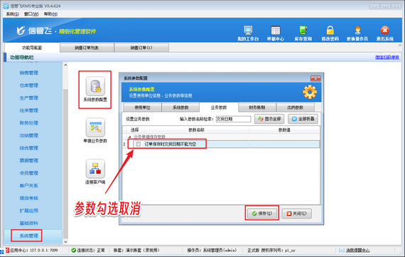 在功能導航窗點擊“系統管理”—》“系統參數配置”—》“業務參數”打開業務參數配置界面,在業務單據保存參數內取消勾選“訂單保存時交貨日期不能為空”參數,然后點擊“保存”按鈕保存參數設置,如下圖所示。