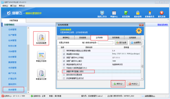 在功能導航窗點擊“系統管理”—》“系統參數設置”—》“業務參數”打開業務參數配置界面,如下圖所示,在特殊功能參數中找到“銷售開單可查看入庫價”參數,取消勾選此參數,然后點擊“保存”按鈕保存參數配置。