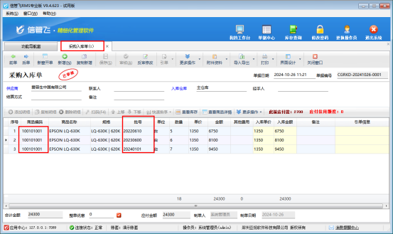 啟用批號(hào)管理后打開采購(gòu)管理“采購(gòu)入庫(kù)單”,界面設(shè)計(jì)單據(jù)明細(xì)中勾選顯示出“批號(hào)”,新增采購(gòu)入庫(kù)單,選擇同一個(gè)商品,錄入不同批號(hào)不同入庫(kù)數(shù)量,如下圖所示: