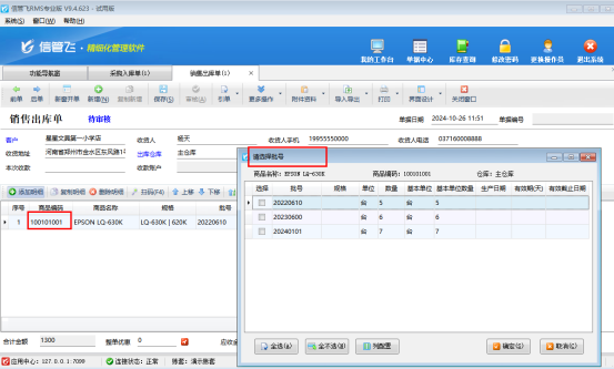 商品入庫(kù)完成后,點(diǎn)擊銷售管理“銷售出庫(kù)單”,選擇此商品出庫(kù),會(huì)自動(dòng)彈出選擇批號(hào)界面,勾選不同批號(hào)進(jìn)行出庫(kù),如下圖所示: