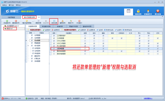 首先使用系統(tǒng)管理員賬號(hào)登錄軟件,在功能導(dǎo)航窗點(diǎn)擊“系統(tǒng)管理”—》“操作員及授權(quán)”打開(kāi)操作員管理及授權(quán)界面,選擇操作員賬號(hào)“張亞”,在右側(cè)的功能模塊權(quán)限內(nèi),選擇綜合管理模塊,將還款單管理的“新增”權(quán)限勾選取消,然后保存權(quán)限設(shè)置,如下圖所示。