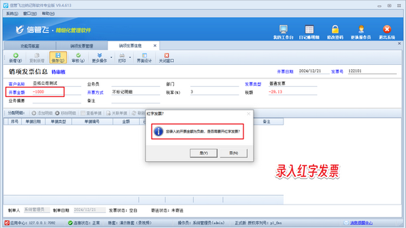 面對紅字發票的登記難題,信管飛出納記賬軟件提供了簡單明了的解決方案。錄入銷項發票時,若需開紅字發票,只需將開票金額設為負數,系統即刻提示并確認,操作便捷,省時省力。