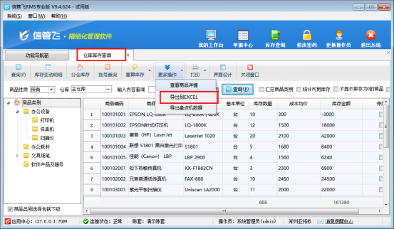 功能導航窗點擊“倉庫管理”,右側相關查詢統計下打開“庫存查詢”界面,如果存在多倉庫,先選擇“倉庫”,在工具欄“更多操作”下選擇“導出到Excel”,導出Excel文件,如下圖所示: