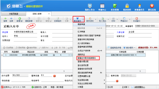 已結銷應付款的單據需要反審修改,需變為“未結銷”狀態,快捷操作方式,在采購入庫單界面點擊更多操作下的“查看應付款及結銷情況”,彈出界面點擊“查看結算單”如下圖所示: