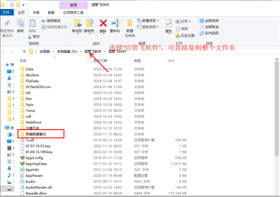 選擇桌面圖標,點擊鼠標右鍵選擇“打開文本位置”,可打開文件保存位置,選擇“信管飛軟件”文件夾,復制整個文件夾到新電腦上,如果文件過大,可把“賬套備份文件”中的之前日期數據刪除。如下圖所示: