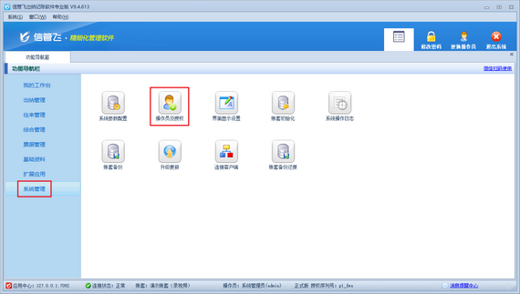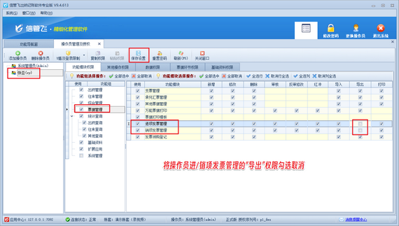 系統管理員登錄軟件,在功能導航窗點擊“系統管理”—》“操作員及授權”,進入“操作員管理及授權”界面,選擇操作員“張亞”,在其右側的功能模塊權限內選擇“票據管理”模塊,將進/銷項發票管理的“導出”權限勾選取消,然后保存權限設置,如下圖所示。