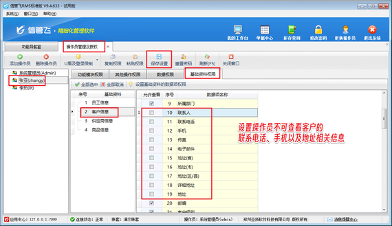 以信管飛RMS標準版為例,這款軟件提供了強大的權限管理功能,讓企業管理者能夠輕松設置操作員對不同數據的訪問權限。比如,你希望某些操作員無法查看客戶的聯系電話和地址信息,以確保客戶隱私不被泄露。
