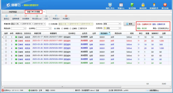 實時狀態追蹤:紅/藍/綠/黑四色預警系統,清晰區分超期、近期待交貨、正常待交貨及完成狀態。
