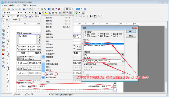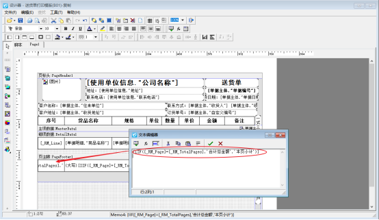 如最后一頁需要同時顯示本頁小計及總計的情況下,可以添加欄目“數據注腳”。然后在“數據注腳”內設置最后一頁的金額小計,添加計算文本框,計算最后一頁小計。計算文本框統計欄目:細項數據DetailData1 統計條件為:[_RM_Page]=[_RM_TotalPages]