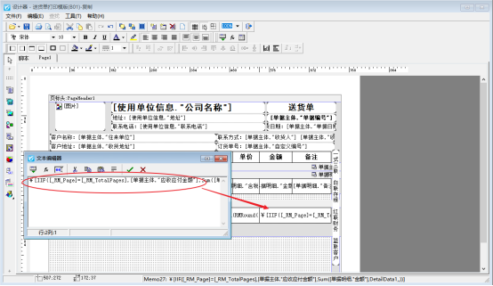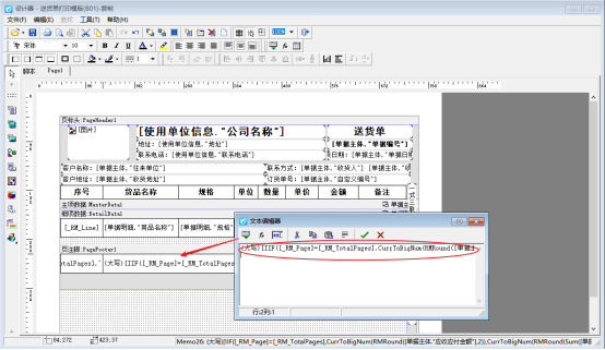 大寫數據顯示:(大寫)[IIF([_RM_Page]=[_RM_TotalPages],CurrToBigNum(RMRound([單據主體."應收應付金額"],2)),CurrToBigNum(RMRound(Sum([單據明細."金額"],DetailData1,,),2)))],如圖: