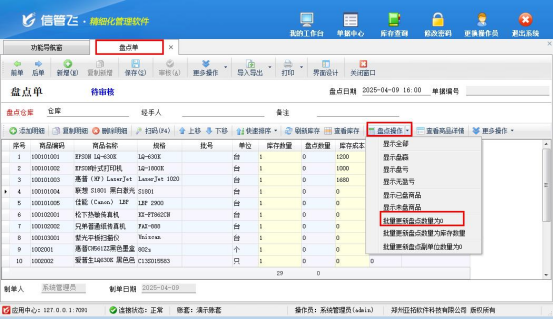 3.批量更新盤點數量:商品選擇完成后,在明細工具欄的盤點操作下,選擇 “批量更新盤點數量為 0”,軟件會直接批量設置商品盤點數量為 0,方便又高效。