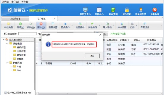 信管飛軟件刪除沒有開單的客戶信息時提示“當前選擇的往來單位已有出納日記賬記錄,不能刪除”,如何解決?如下圖所示: