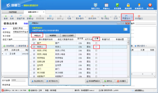 但如果您的企業不需要在開單時錄入收貨人信息,操作起來也非常簡單。只需在開單界面點擊上方工具欄的“界面設計”,選擇“單據主體”,在眾多數據項中找到“收貨人”,然后取消必填項的勾選符號,最后保存設置即可。