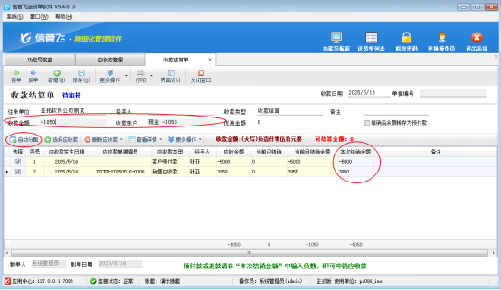在應收款管理界面點擊收款結算,進入收款結算單單據界面,在該界面錄入收款金額和收款賬戶,客戶預付款和銷售應收款抵消結算,多余預付退回,收款金額輸入負1050元,點擊自動分配,如圖