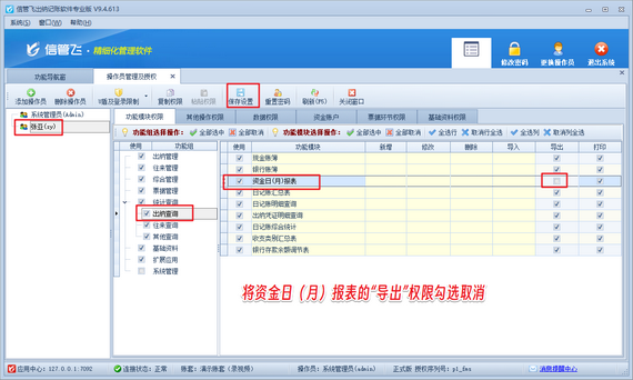 登錄軟件,在功能導(dǎo)航窗點擊“系統(tǒng)管理”—》“操作員及授權(quán)”,進(jìn)入“操作員管理及授權(quán)”界面,選擇操作員賬號“張亞”,在其右側(cè)的功能模塊權(quán)限內(nèi)選擇“出納查詢”,將資金日(月)報表的“導(dǎo)出”權(quán)限勾選取消,然后保存權(quán)限設(shè)置,如下圖所示。