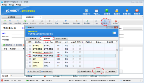 在功能導航欄點擊“銷售管理”---銷售出庫單,打開銷售出庫單界面,在該界面點擊“界面設計”按鈕,在單據明細項勾選參數“當前庫存數量”,點擊保存按鈕,關閉銷售出庫單界面重新打開,即可刷新商品當前庫存。