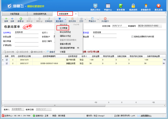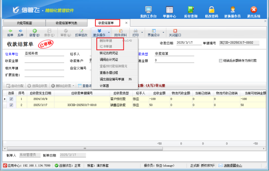 權(quán)限設(shè)置完成后,操作員重新登錄軟件,再次進(jìn)入收款結(jié)算單界面,就會發(fā)現(xiàn)紅沖刪除按鈕已經(jīng)恢復(fù)正常,可以順利完成相關(guān)操作。