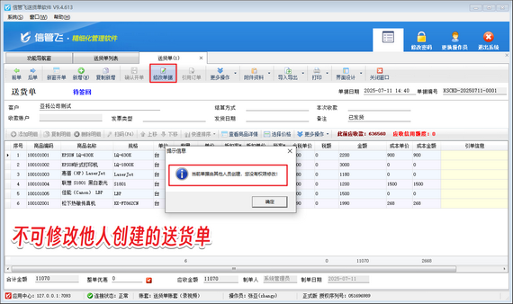 有用戶操作員賬號登錄軟件在修改送貨單時,無法修改送貨單,提示:“當前單據由其他人員創建,您沒有權限修改!”如下圖所示。