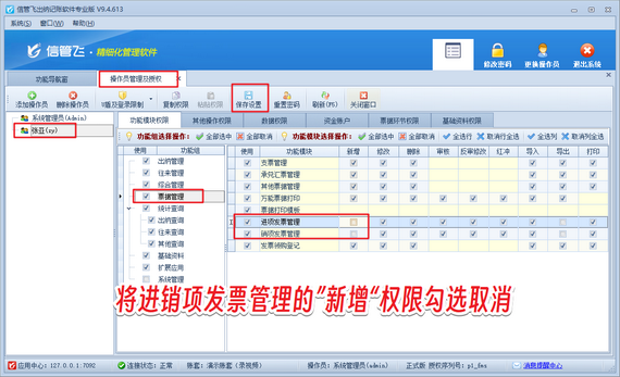 系統(tǒng)管理員賬號登錄軟件,在功能導(dǎo)航窗點(diǎn)擊“系統(tǒng)管理”—》“操作員及授權(quán)”,進(jìn)入“操作員管理及授權(quán)”界面,選擇操作員賬號“張亞”,在其右側(cè)的功能模塊權(quán)限內(nèi)選擇“票據(jù)管理”模塊,將進(jìn)/銷項(xiàng)發(fā)票管理的“新增”權(quán)限勾選取消,然后保存權(quán)限設(shè)置,如下圖所示。