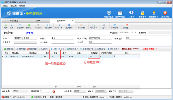 訂單數量100臺,第一次發貨數量20臺,第二次發貨數量10臺,累計數量30臺,打印預覽效果圖如下:
