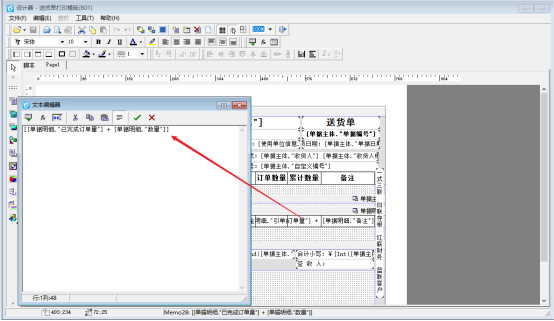 出庫單打印模板上顯示訂單累計數量,在開單界面打印下選擇“打印格式設計”,進入打印格式設計界面,點擊設計格式,進入模板設計器界面添加累計數量,調用數據項:[[單據明細."已完成訂單量"] + [單據明細."數量"]],如下圖所示: